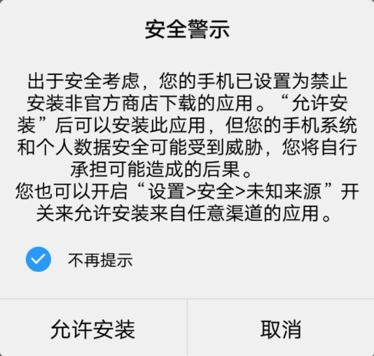 2.应用均在官方指定渠道发布下载,拥有足够的安全保障。因未上架应用市场,设备自动判定为未知来源应用,部分手机因默认禁止了未知来源应用的安装,故会弹出此提示框。或介意此弹窗,可将"设置-未知来源应用"开关开启,保障后续应用的安装。